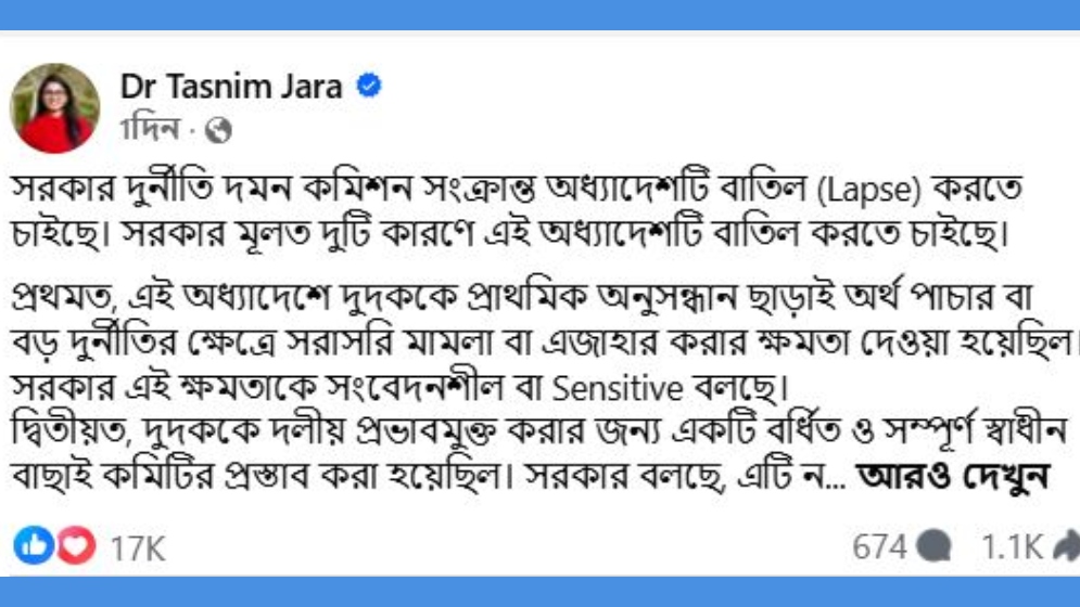 পোস্টে তাসনিম জারা বলেন, সরকার দুর্নীতি দমন কমিশন সংক্রান্ত অধ্যাদেশটি বাতিল করতে চাইছে। সরকার মূলত দুটি কারণে এই অধ্যাদেশটি বাতিল করতে চাইছে।